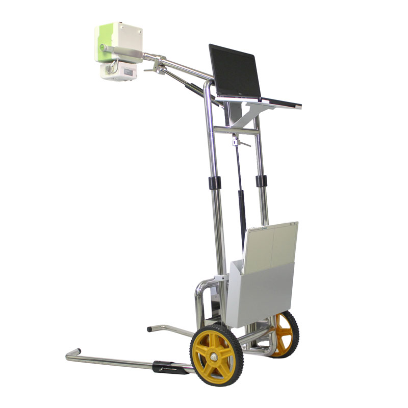 The portable cart is practical and easy-to-use (including on-board storage for a laptop computer and DR panel). It is designed so one person can easily load it into most liftback cars, vans and utility vehicles. It folds up compactly to a dimension of just 1360 x 630 x 630 mm and weighs 75 kg.